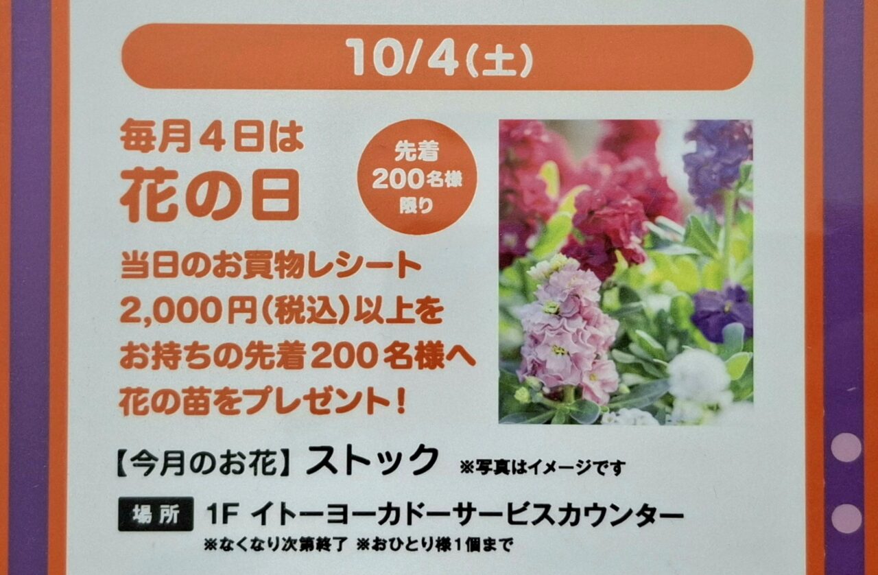 あびこショッピングプラザでは、イトーヨーカドーと専門店の企画として每月4日にお花をプレゼントしていますが、10月も開催されますよ!