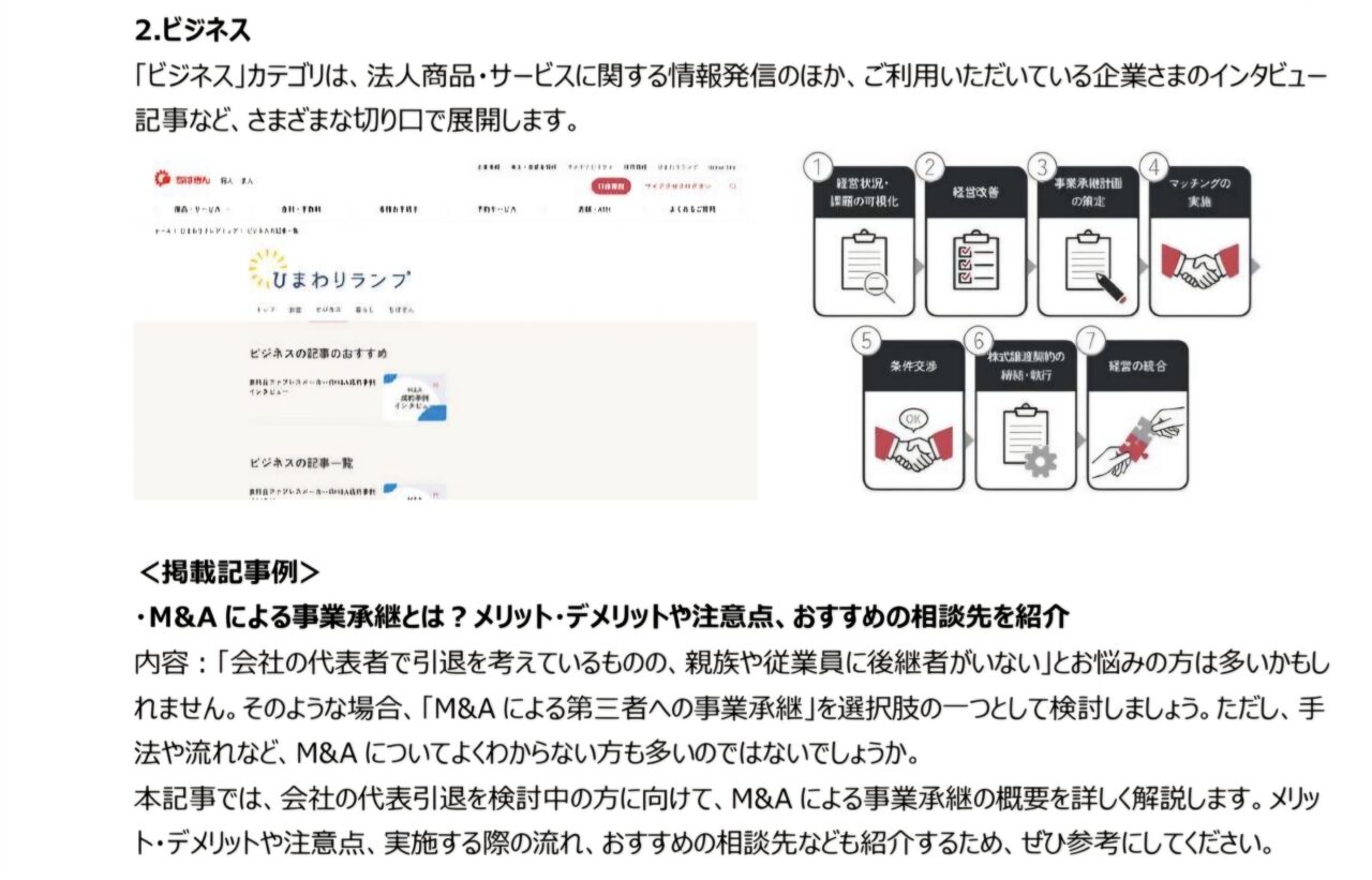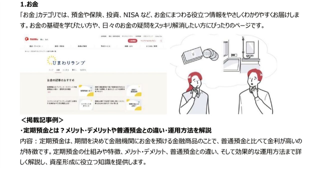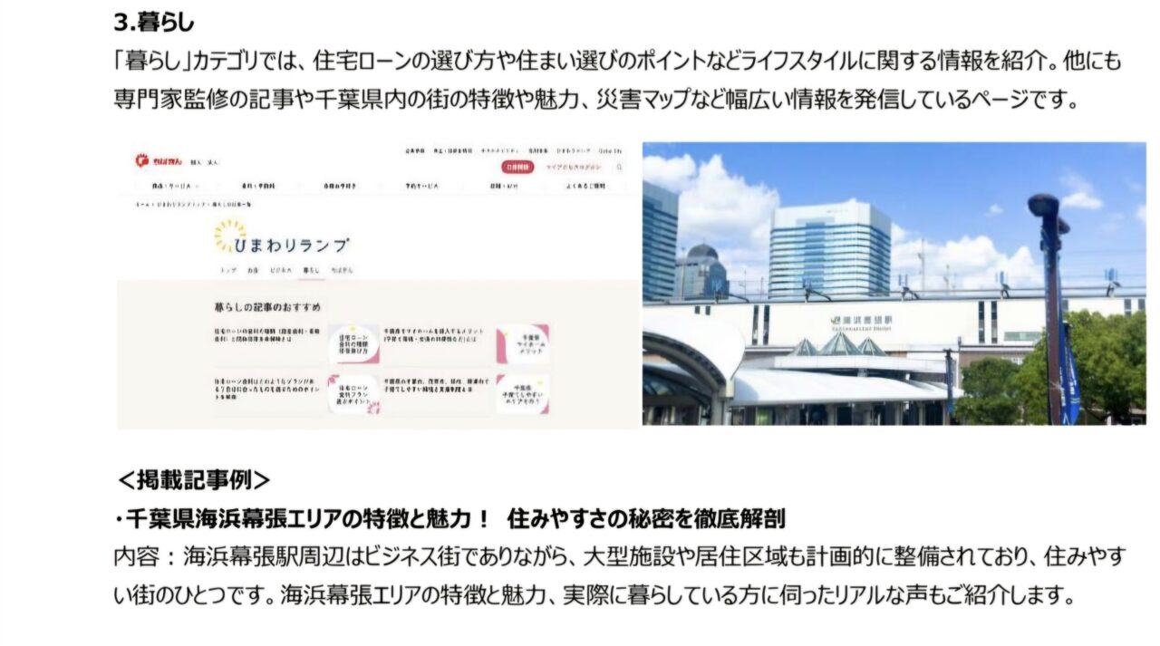 「ひまわりランプ」は千葉銀行の情報サイトで、読者の悩みや疑問に寄り添って解決に導き、心を明るく照らすことをコンセプトとしています。「お金」、「ビジネス」、「暮らし」、「ちばぎん」という4つのカテゴリに分けて、投資、資産運用、貯蓄、M&A、住宅ローンなどの情報から、専門家監修記事、ちばぎんグループの地域活性化の取組みまで幅広い情報を発信、地域活性化やOne to Oneマーケティングを目指します。