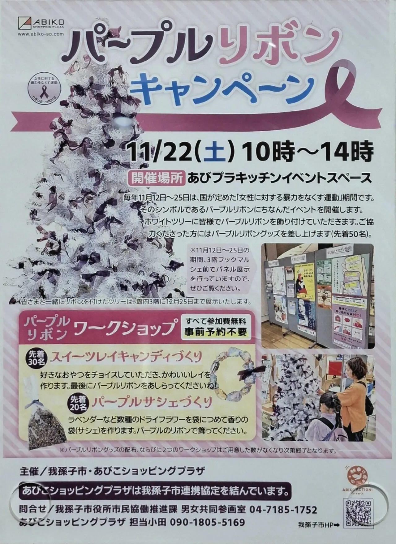 【我孫子市】あびこショッピングプラザで、「女性に対する暴力をなくす運動期間」のシンボルであるパープルリボンにちなんだイベントを開催します