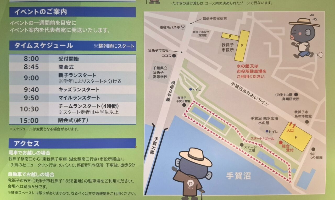 うなきちカップは、一周800mの手賀沼親水広場特設コースを走るランニングイベントです。小学生が対象のキッズランや親子ラン、中学生以上のマイルランに加え、1チーム2~10人でひたすら4時間走りつづけるチームランがあります。