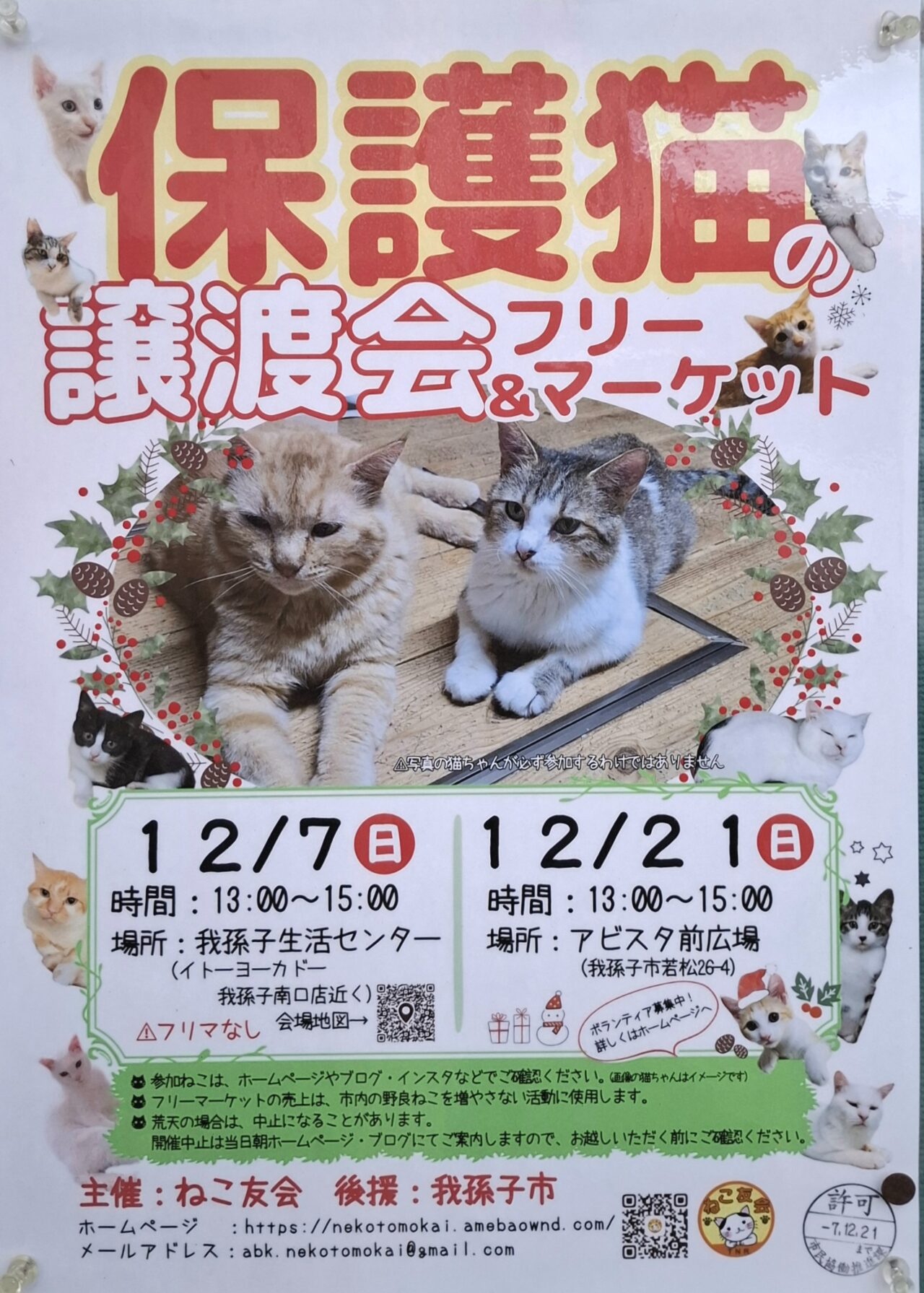 明日からいよいよ12月。今年最後の「保護猫の譲渡会&フリーマーケット」開催のお知らせです。