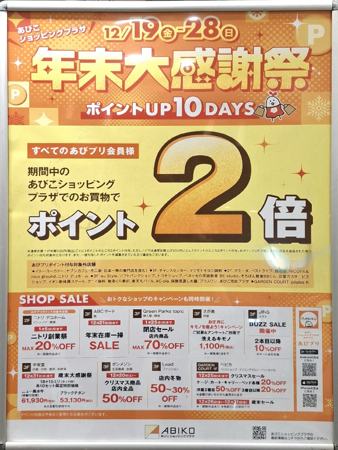 あびこショッピングプラザの公式アプリ「あびプリ」で貯まる「あびプリポイント」が、通常の2倍たまるキャンペーンが始まります。