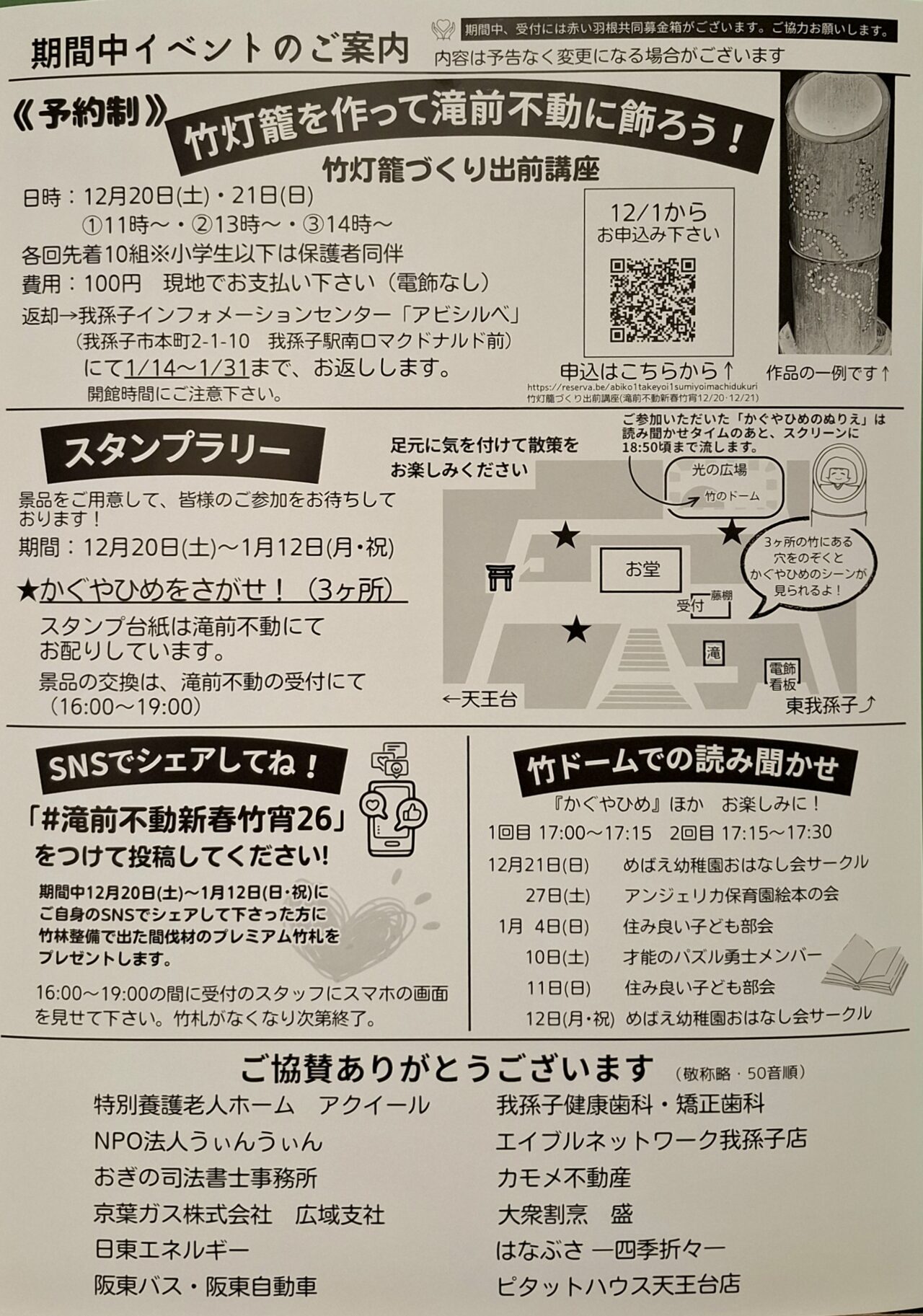 そしてこの他にも、週末にはキッチンカーが来たり、「#滝前不動新春竹宵26」をつけてSNSでシェアすると竹札がもらえたり、楽しいイベント盛りだくさんです!