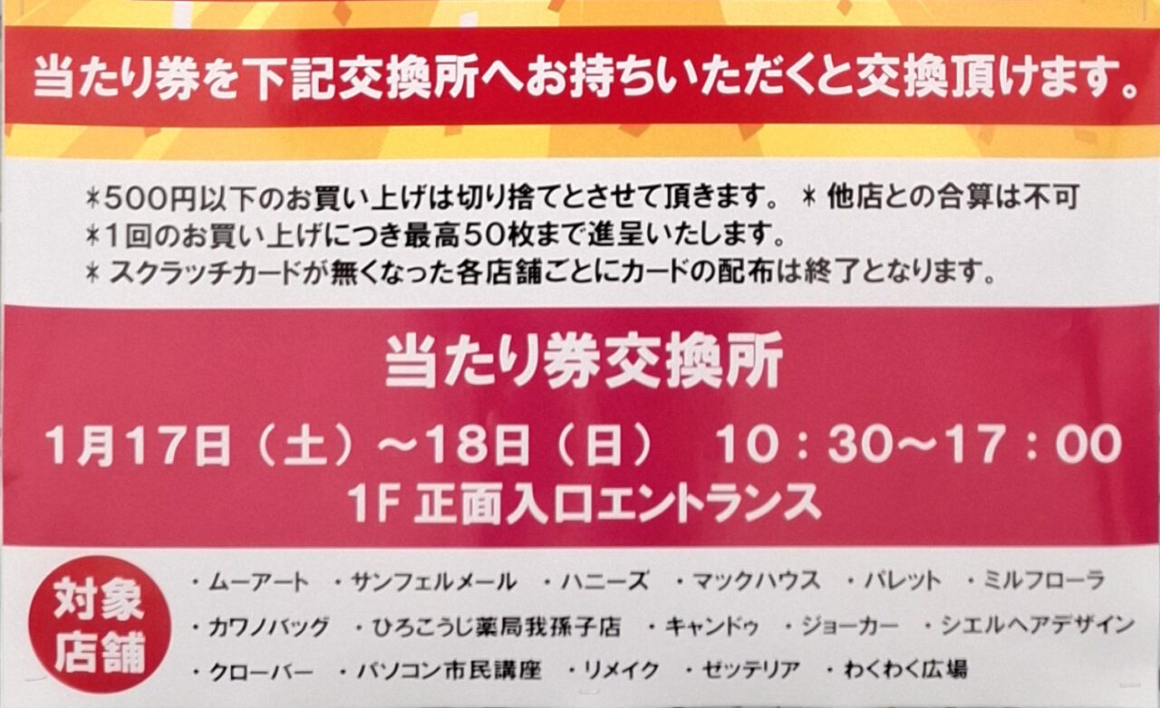 対象店舗にてお買物をすると、500円ごとにスクラッチカードが貰えます。スクラッチを削って当たりが出たら、1/17・1/18の2日間の交換期間内に1階エントランスにお持ちくださいね。専門店お買物・お食事割引券500円分と交換できます。