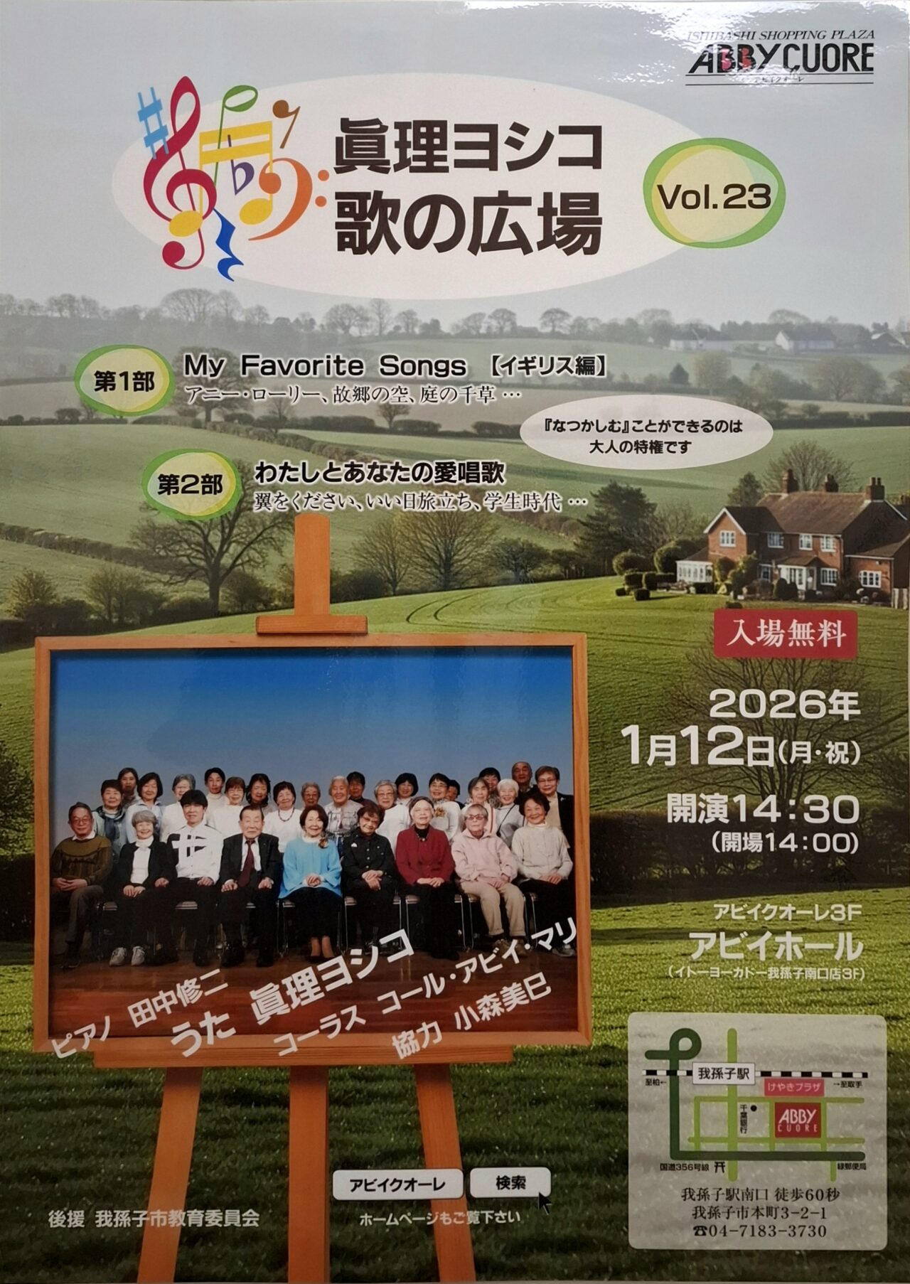 【我孫子市】入場無料!「眞理ヨシコ 歌の広場」、アビイホールで今年も開催しますよ