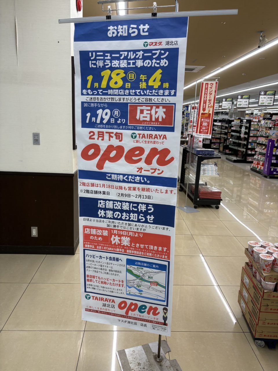 マスダ湖北店が改装により1ヶ月ほど休業、改装後はTAIRAYAに変わるようです。2階のダイソーやカワチも時期によっては閉店するそうです。