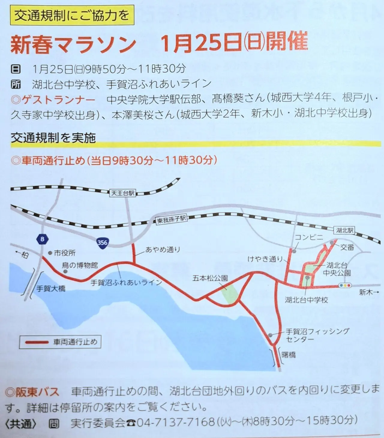中学校を出発して、手賀沼ふれあいラインを走るコースになるため、9時50分~11時30分の間、交通規制がありますのでご注意ください。