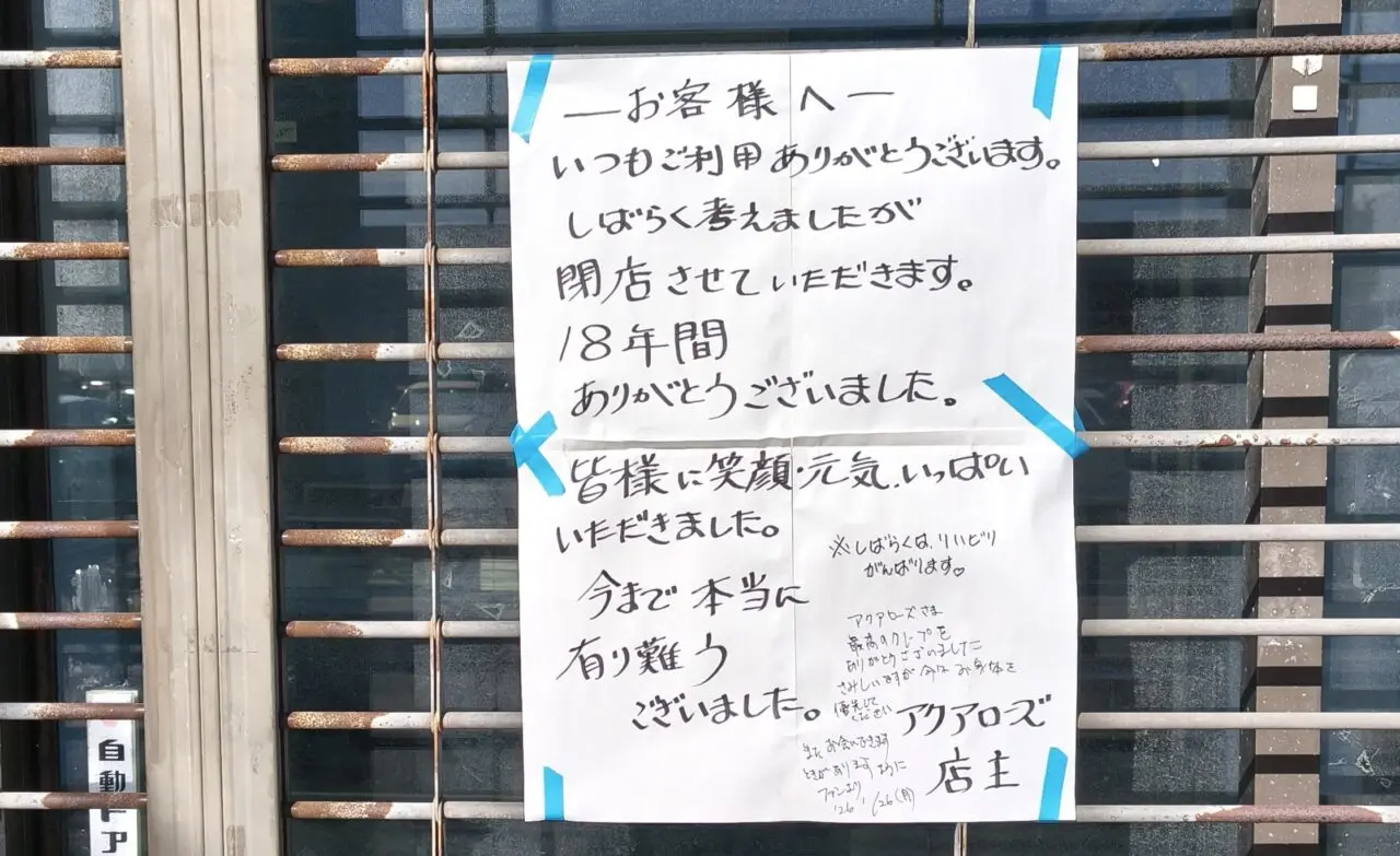 【我孫子市】天王台の、クレープが美味しいと人気だった「アクアローズ」が、残念ながら閉店したそうです