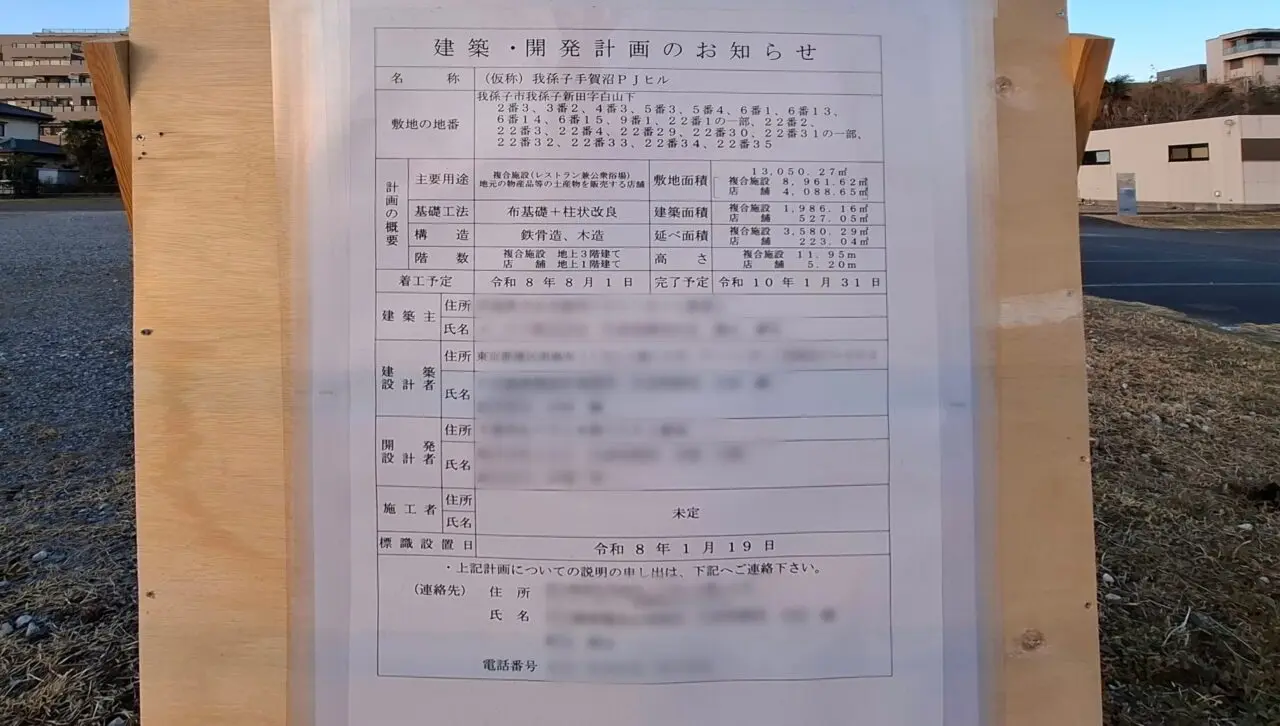 【我孫子市】手賀沼ふれあいライン沿い旧直売所跡地に、複合観光施設の「建築・開発計画のお知らせ」が掲示されていました