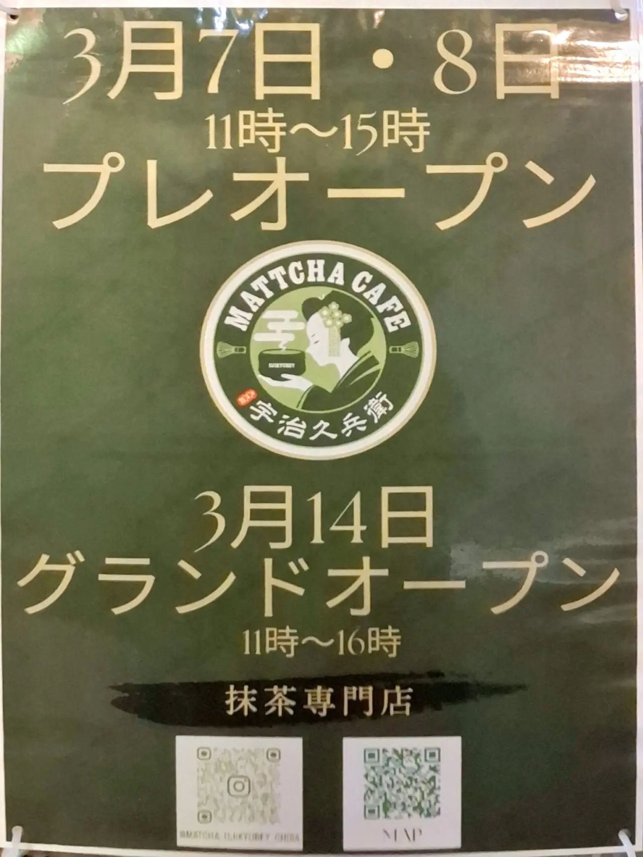 抹茶力フェ九代目字治久兵衛 (千葉キッチンカー店)は、2026年3月7日(土)・8日(日)11時~15時にプレオープンし、3月14日(土)のグランドオープンからは11時~16時の営業になるようです。