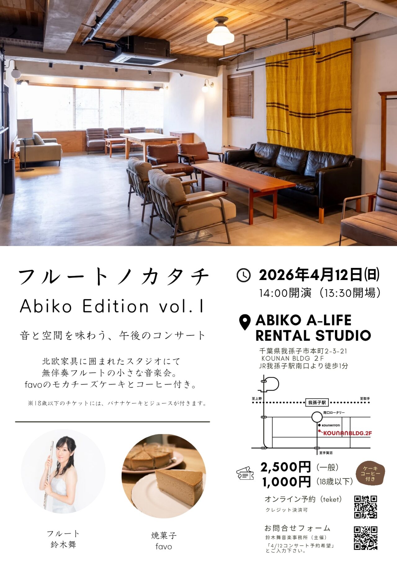 写真の「ABIKO A-LIFE RENTAL STUDIO」で行われる、スイーツ付きのアットホームなフルートコンサートに興味を持った方は、ぜひお申込みくださいね!