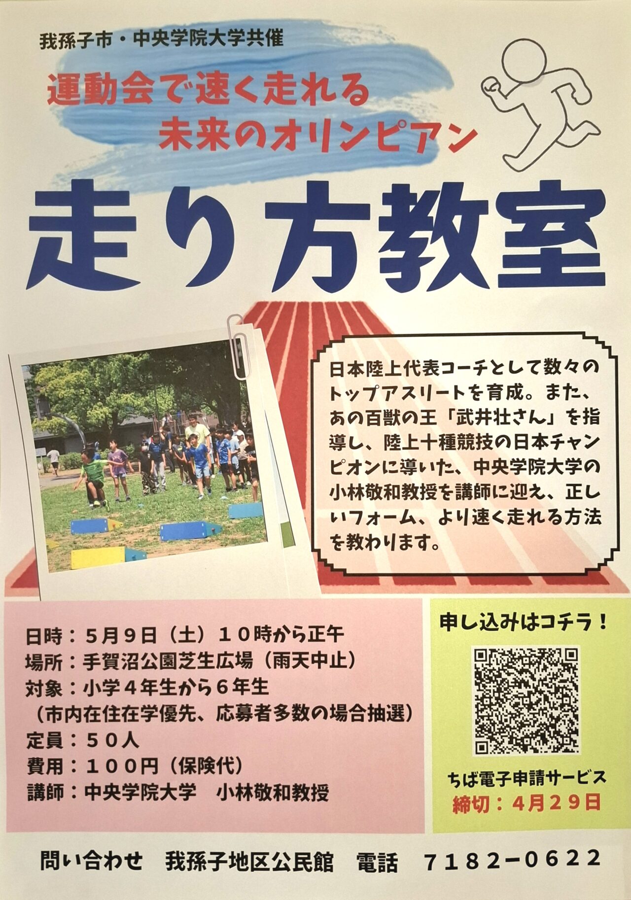 我孫子市と中央学院大学が共催する、小学生向けの「走り方教室」が開催されますよ。